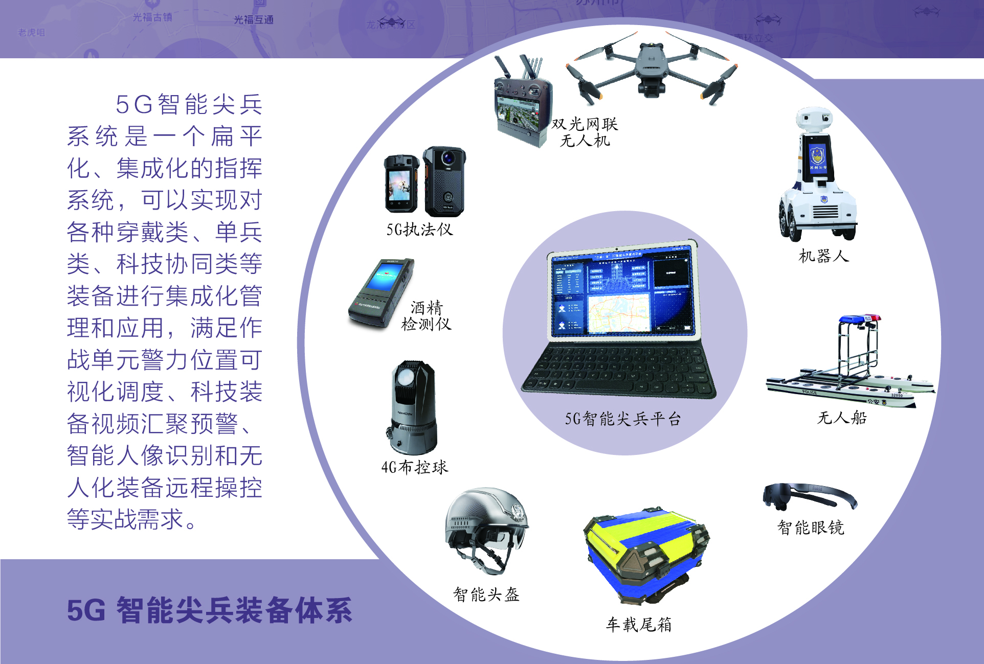 • 5G智能尖兵裝備系統,概括為“1+N+1”科技裝備體系,即立足基層一線巡特警和公安派出所的最小作戰單元,圍繞科技類單警、車載和協同裝備的實戰使用集成,深度打造應對常態化立體巡防、現場特殊案事件或重大警情處置,實現前端作戰單元與后臺情指中心的扁平化指揮,力求成為科技賦能戰斗力提升的倍增器。